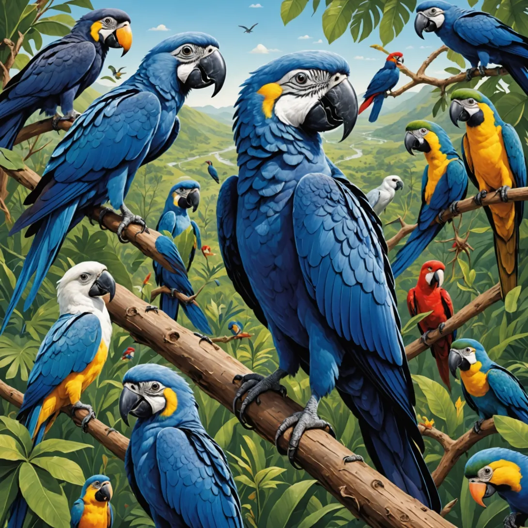- Ара Гиацинтовый: крупнейший попугай, славится ярким оперением и долголетием.